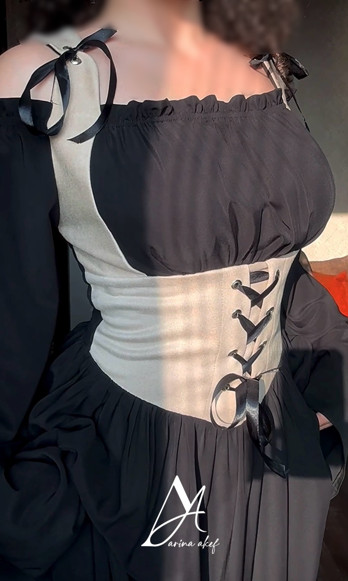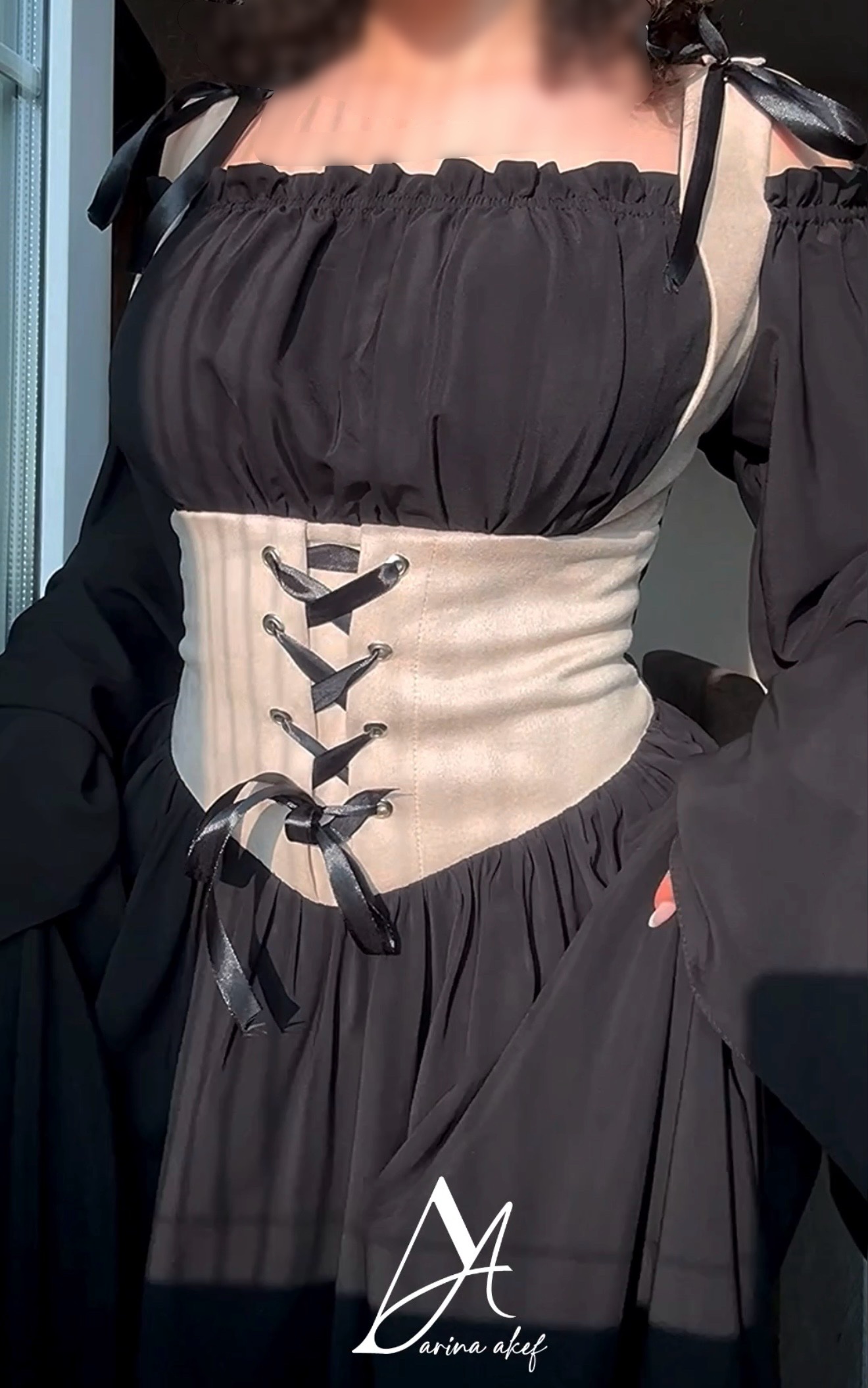 پیراهن مشکی شولدر اف استین کلوش کرست شیری رنگ